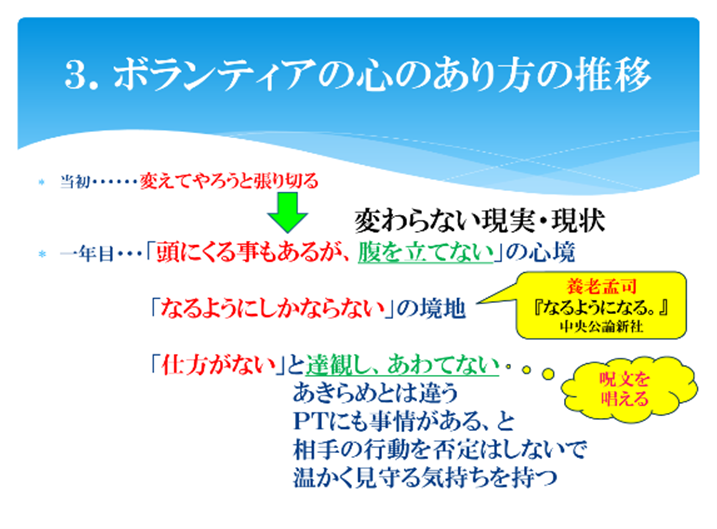 このように連日のリハビリ・ボランティア活動をされている中で、その多くの時間を共に働いたミャンマーのPT(理学療法士)達との間には様々な葛藤も有ったが、異文化の中での活動で感じられたこと、苦労されたことなど、心の在り方の変遷について以上のようにまとめられている。ミャンマーのPT達の仕事の仕方等には日本人から見ると不十分な所も指摘されているが、当然ミャンマーでも人間や環境・条件等の違いは有り、梅崎さんの経験したことのみで理解するべきではない。我々は、この貴重な報告を契機としてより多面的な情報・知識を得るよう努力し今後の交流・支援等に繋げるべきと思われる。