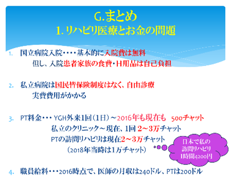 ⑧医師・PTの給料は極めて低く、例えば2016年当時、医師が月給240ドル、PTが200ドル (1ドルが1000チャット、110円程度の時代)であり、退勤後、医師(PTも)は民間のクリニックで働いたり、PTは訪問リハビリを行ったりして家計を補うことが一般的である。