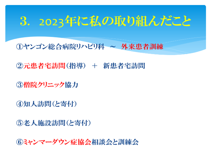 最後に、2006年からのミャンマーでの様々なボランティア活動等の経験からミャンマーのリハビリの課題等について以下のようにまとめ、整理された。