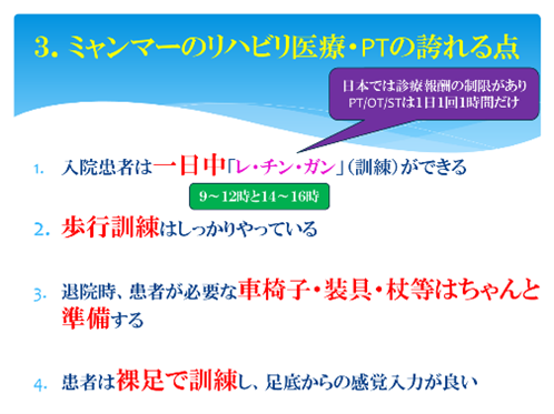②日本では(おそらく世界の趨勢でもあるが)運動療法がPTの中心かつ主流であるが、ミャンマーのPT治療は物理療法が中心で、それに偏っている。