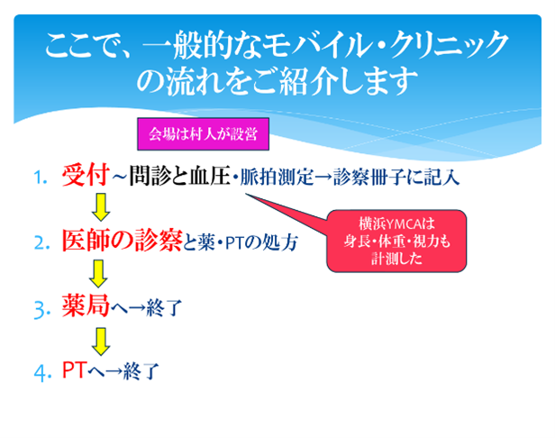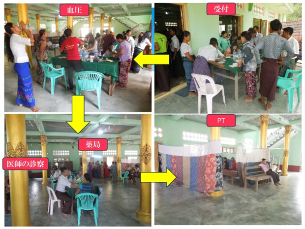 さらに、ミャンマーではPT主体のボランティアによるモバイルクリニックがはじまっており、梅崎さんはそれにも参加されている。概況は以下の通り。