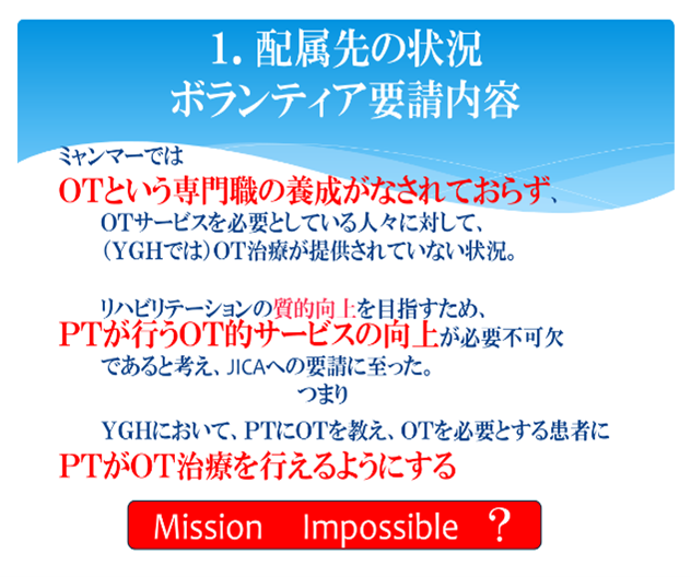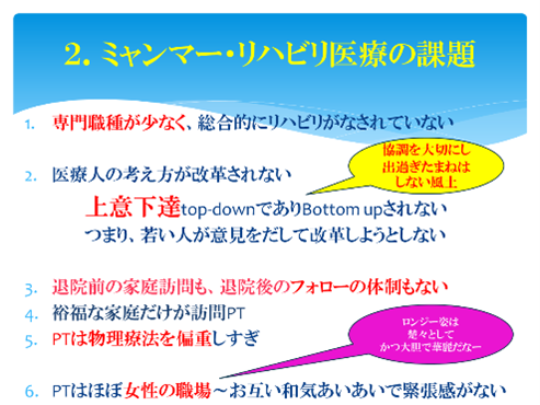 ①日本とほぼ同時期に開始されたミャンマーのリハビリ医療は軍の支配による低迷と混乱の影響で、医師とPTのみによる体制のまま、最近まで細々と維持されていた。