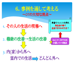 実際の事例についても多数紹介(写真等)され、その経験からOT(作業療法士)の視点について以下のように指摘された。