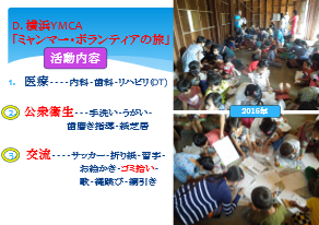 梅崎さんのミャンマーでボランティア活動の原点である横浜YMCAによる「ミャンマーボランティアの旅」についても多くの写真等で紹介されたが、その概要については以下のように紹介されている。