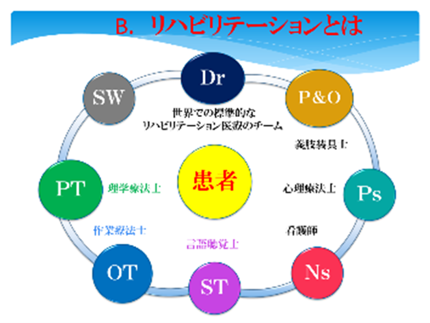①リハビリ医療が専門職種として医師とPTだけで営まれており、包括的リハビリとは言い難い。