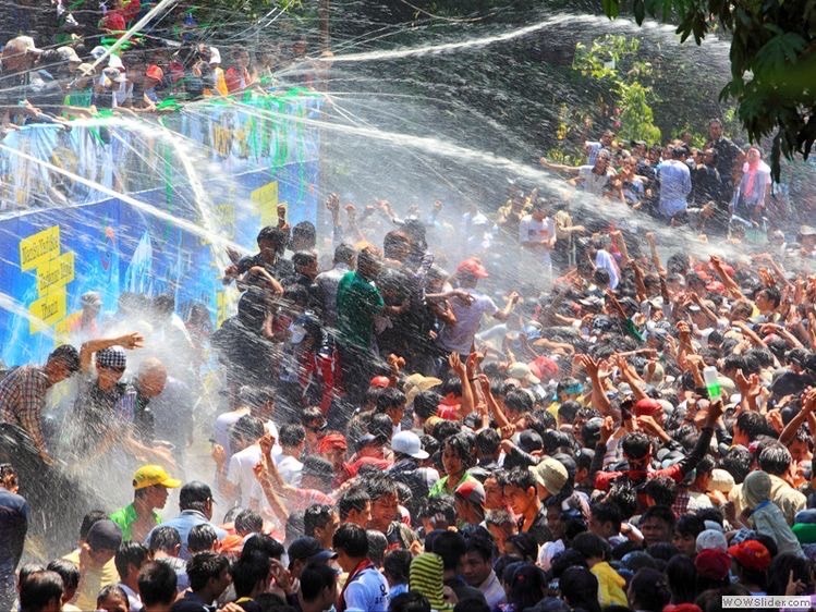 ヤンゴンやマンダレーのような大きな都市では人の集まりやすい大きな通りにお祭りのステージが急遽設えられて、若い人中心にステージ上に上がって歌ったり踊ったり賑やかに盛り上がります。仏教行事の一つであった新年を迎える前に水をかけて浄化する儀式が、ちょうどこの時期は最も暑い時期にあたり人々が水をかけ合って楽しみ、日頃のストレスを発散するお祭りに変化していったようです。中にはお寺にお参りに行ったり、瞑想したりして本来の仏教の修行として新年を過ごす人もあるそうで、お寺に向かう人には水をかけてはいけないらしいです。