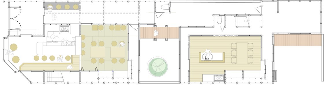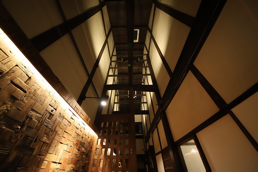 土間の上の火袋の大空間に見応えのある小屋組み( 縦横に木を組み合わせたもの)が良く見られます。 京都が近代化するにつれて明治時代になると町家が大型化してゆき、二階があるのが一般化して行く過程で構造を支えるために出来た仕 組みなんだそうです。「じゅんとうさんぺき」とは元々お寺に準じた小屋組みでした。二階建てになり「火袋」(吹き抜け)とするとそこだけ二階がない分重みが足りなくなります。重みを足すための造作であると同時に大工の腕の見せ所でもありました。私たちはその当時の大工さんの職人としての心意気を今でも見ることができます。丸太などを縦横に組み合わせて、素材の良さ、組み合わせのセンスの良さや腕の素晴らしさを見せつけるものになっています。